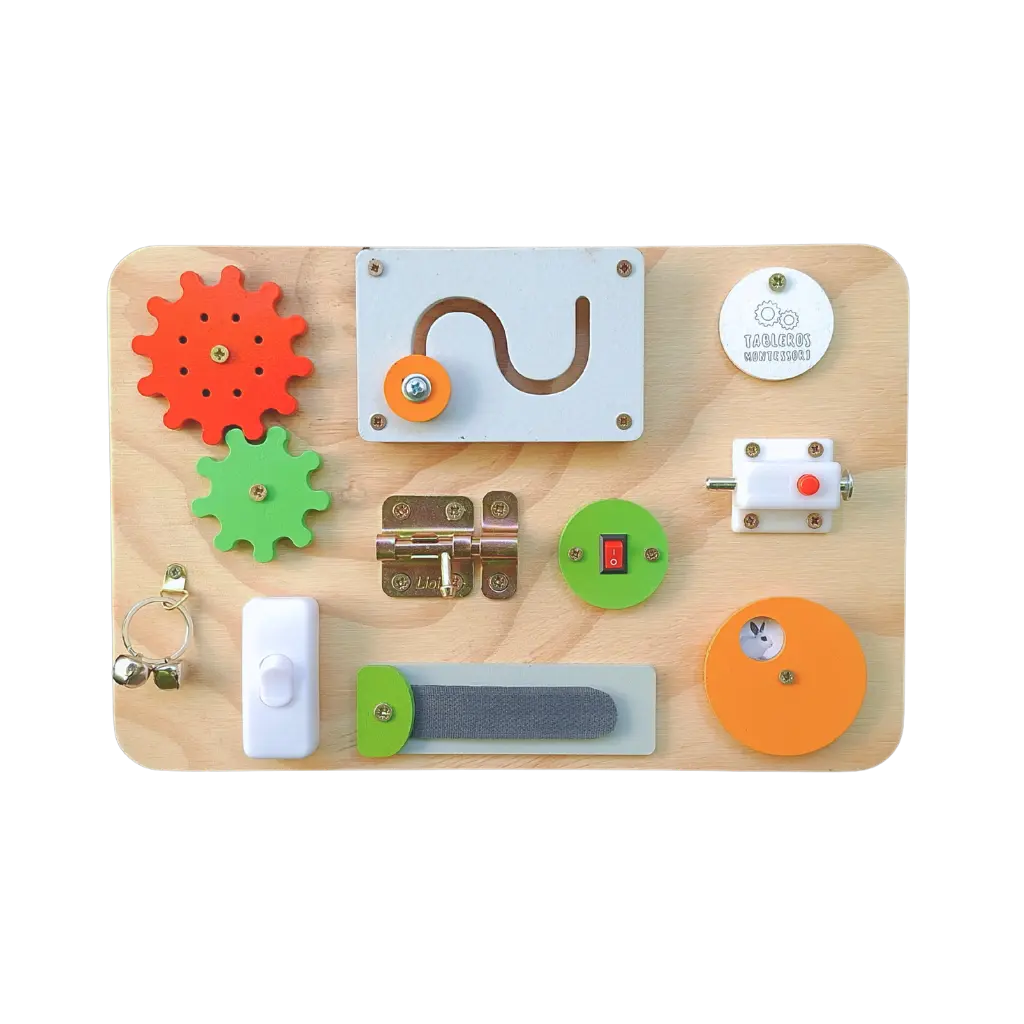 - Estimulación sensorial y motricidad fina: Con elementos como spinner giratorio, camino trazado, velcro y más, cada componente fue elegido para estimular la coordinación mano-ojo, la destreza motriz y el descubrimiento táctil.
