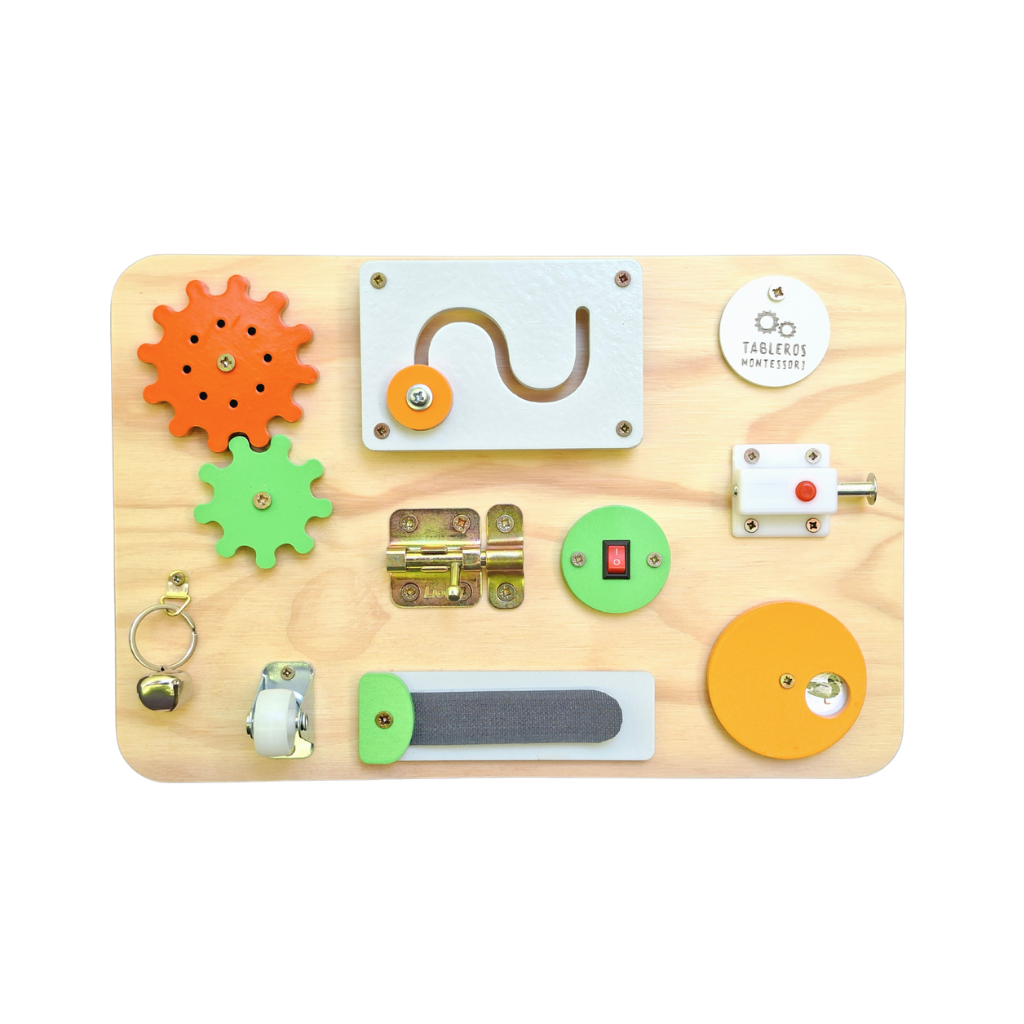 - Estimulación sensorial y motricidad fina: Con elementos como spinner giratorio, camino trazado, velcro y más, cada componente fue elegido para estimular la coordinación mano-ojo, la destreza motriz y el descubrimiento táctil.